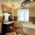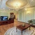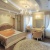 Светлая кремовая палитра хозяйской спальни оттенена умеренным количеством позолоты, благодаря чему создан гармоничный баланс между нарядностью декора и мягкостью пастельных тонов. Повторяющаяся тема полукруга в ванной комнате заключает в единый ансамбль изгибы в оформлении потолка, драпировку штор, форму ванной и подиума под ней, плавные линии умывальника.