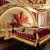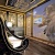 Спальня очень эмоциональная, опьяняющая своим величием и богемностью. Насыщенный бордо и искрящееся золото – неповторимое сочетание. У изголовья кровати распустился бутон алой бархатной лилии, за ним – роспись с барельефом из нежных роз, обрамленная венком из райских золотых листьев. Кровать будто стоит на троне – черный монохромный пол в этом месте покрашен золотой краской. Люстра похожа на переплетение французского кружева ручной работы: тонкая, хрупкая, нежная. Покой и душевное равновесие комнаты в кабинете владельца охраняет крылатый мифический конь Пегас. Вглубь витиеватых орнаментов увлекают неповторимые золотисто-синие витражи-окна на фоне иссиня-черной стены.