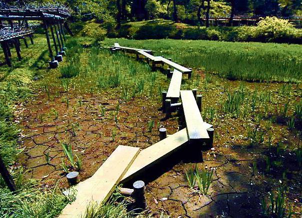С берегом их соединяет мостик— деревянный или пошаговый, выполненный из камней. Если к острову подхода нет, то согласно японским традициям он символизирует остров бессмертных и будет особо почитаемым (чистым, священным) местом в саду. Остров бессмертных японцы отождествляют с легендарными островами бессмертных отшельников, расположенных далеко в океане. Японцы верят, что созерцание такого острова продлевает жизнь.