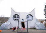 В Германии построили начальную школу в форме кота: большие круглые окна имитируют глаза кота, а двери с красным ковриком – рот.