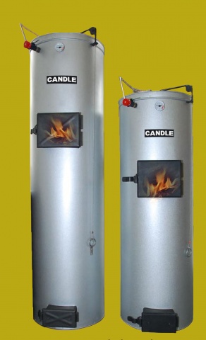 Твердопаливний котел "Candle" призначений для обігріву індивідуальних і промислових приміщень. У топці котла циліндричної форми добре згоряють дрова, тирсові та торф'яні брикети. У котлі застосовано унікальний спосіб спалювання твердого палива, при якому горить тільки верхній шар (10-20см), а не все завантажене в топку паливо. Повітря, що подається в топку, підігрівається вихідним димом і направляється в осередок горіння за допомогою розподільника повітря. Після згорання одного шару дров розподільник повітря опускається нижче і завжди тримається на рівні палаючих дров.